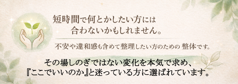ゴキゴキ・ボキボキと音を鳴らし、気分的に楽になれたという、よくある整体と同じ施術はしていません。