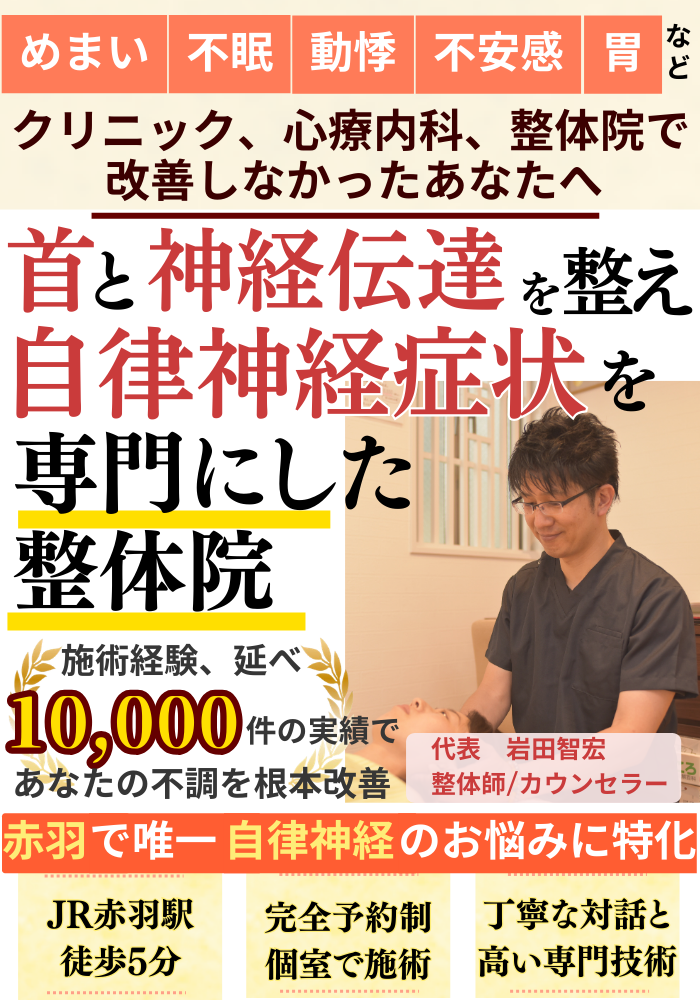 原因がわからず、もしかして自律神経失調症かな?と思い色々な病院、整体を調べていたら妻にこことっても良さそうだよ?と言われたのが岩田先生のところでした。