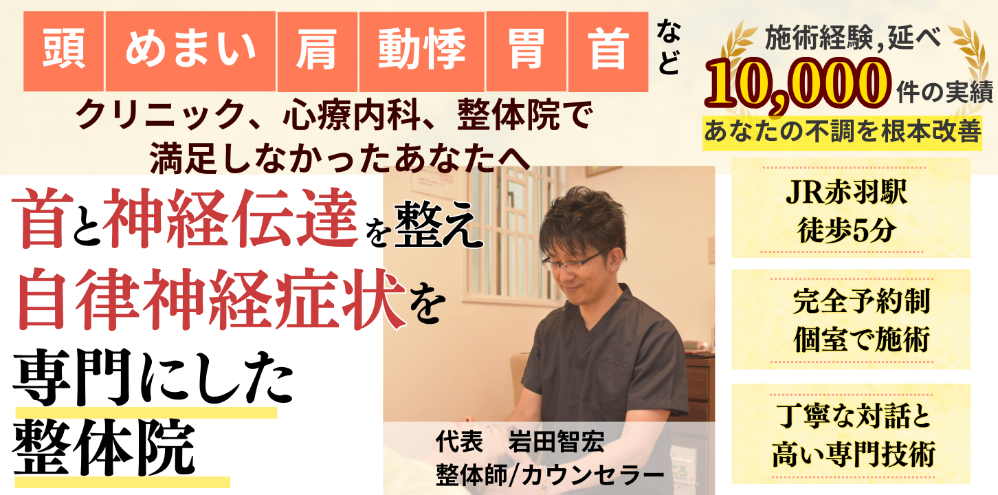 原因がわからず、もしかして自律神経失調症かな?と思い色々な病院、整体を調べていたら妻にこことっても良さそうだよ?と言われたのが岩田先生のところでした。