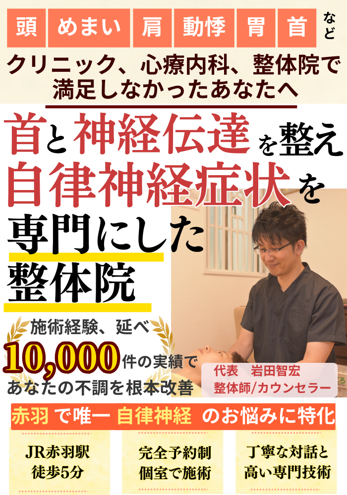 原因がわからず、もしかして自律神経失調症かな?と思い色々な病院、整体を調べていたら妻にこことっても良さそうだよ?と言われたのが岩田先生のところでした。